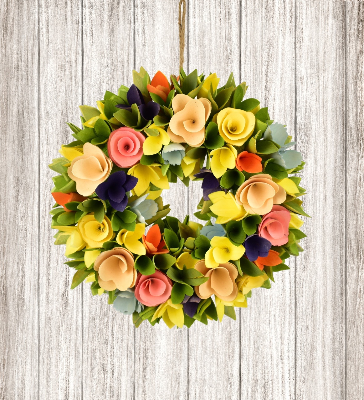 Vytvořte si jarní atmosféru s naším ručně vyrobeným jarním věncem z dřevěných kytiček. Tento stylový doplněk, průměru Ø30 cm, je ideálním způsobem, jak oživit váš interiér či exteriér.