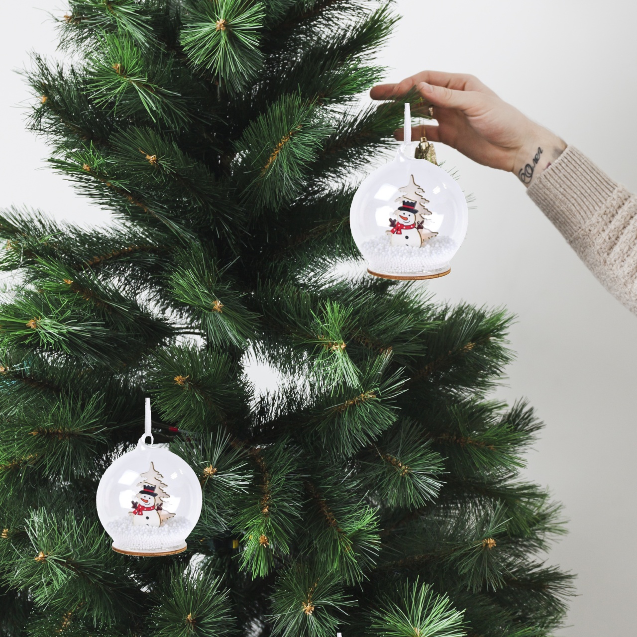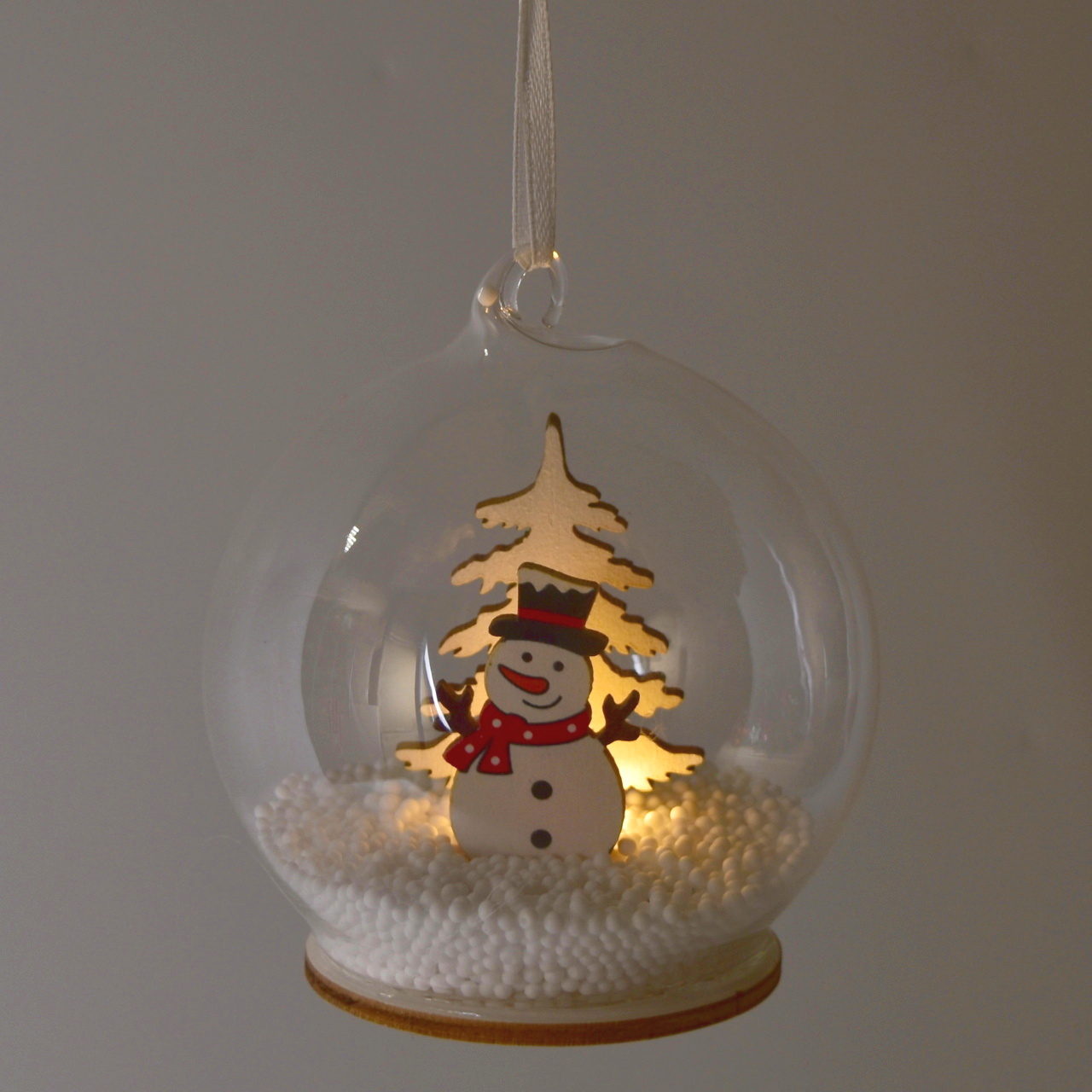 Průhledná baňka se sněhulákem a s LED osvětlením o průměru Ø8 cm je ideální dekorací pro vaši vánoční atmosféru. Tento set obsahuje 3 kusy, které lze snadno zavěsit na vánoční stromeček nebo použít jako stylovou dekoraci v interiéru. Uvnitř koule se nachází sněhulák a dřevěný stromek, doplněný o 1x LED osvětlení a bílé kuličky, které skvěle imitují sníh.