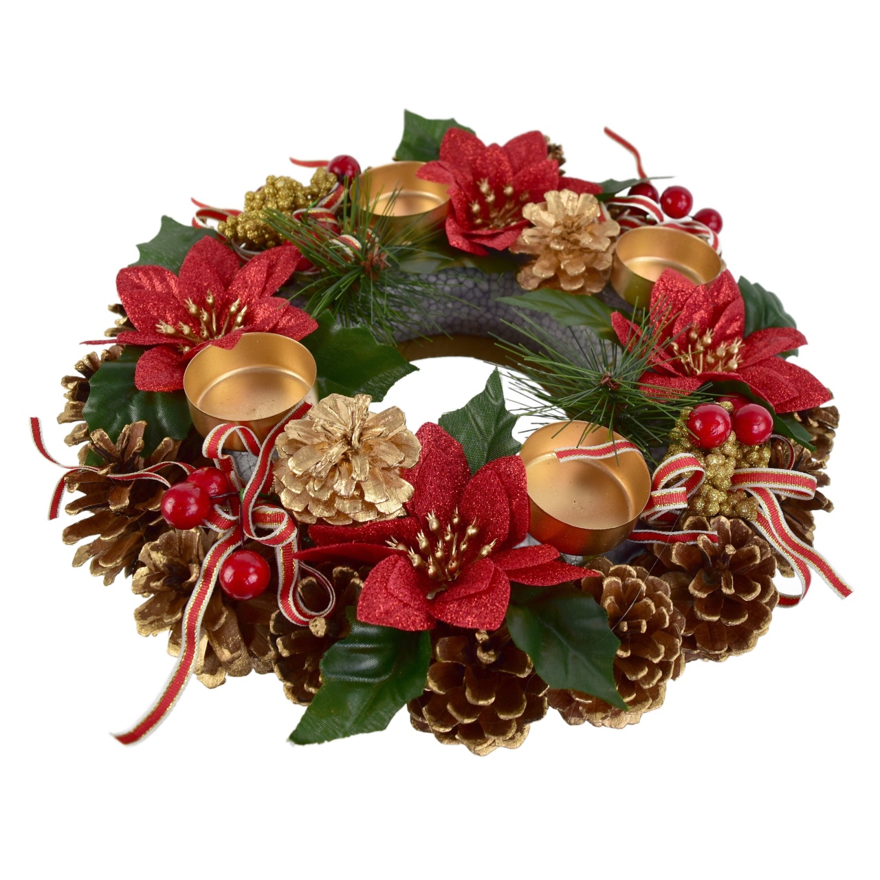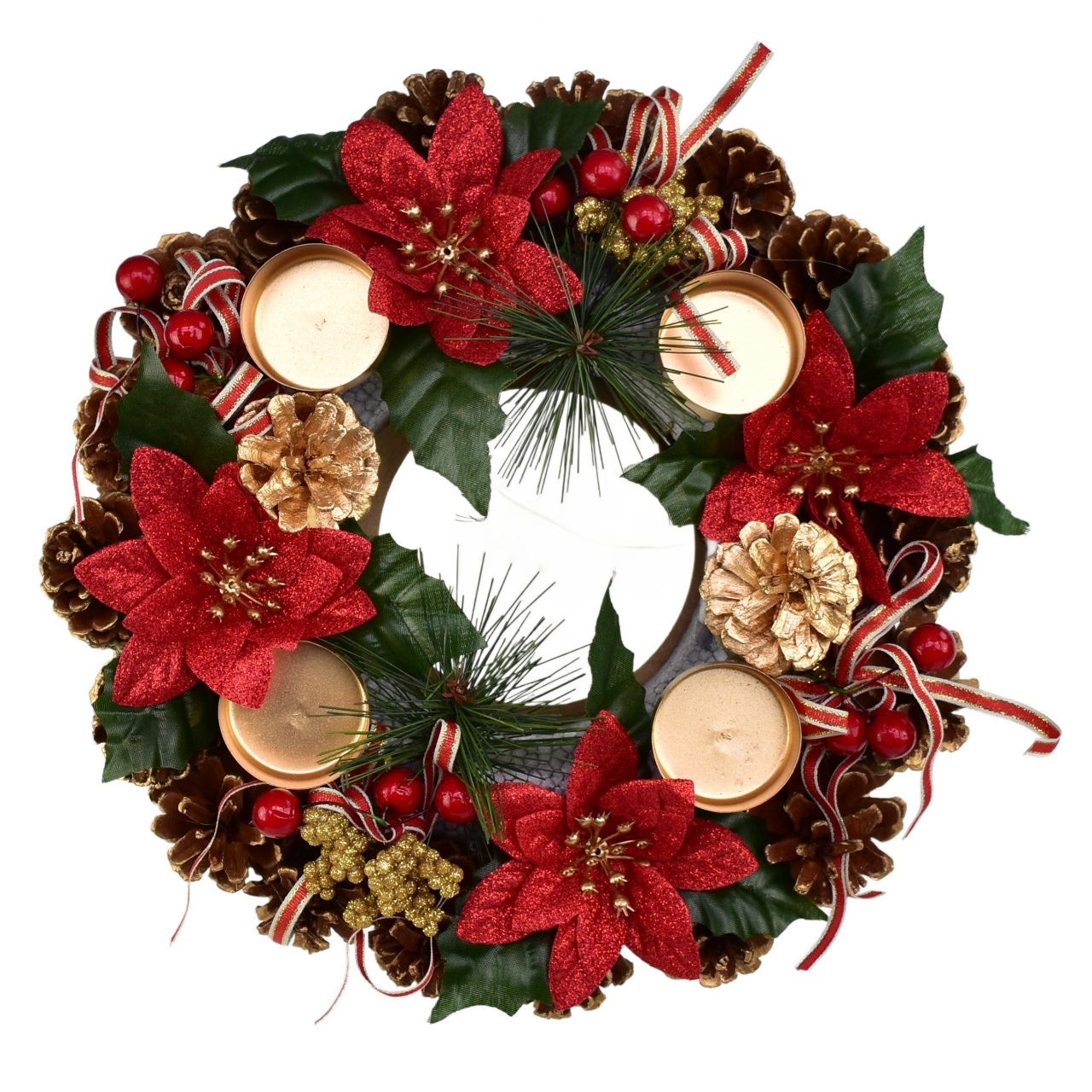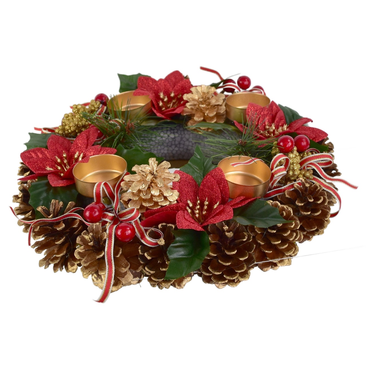 Vytvořte nezapomenutelnou atmosféru během vánočního období s naším adventním svícenem šiškovým s ponsetiemi! Tento krásně zdobený svícen, vybavený čtyřmi ponsetiemi, dokáže proměnit váš domov v kouzelné místo plné radosti a klidu. Jeho elegantní design zahrnuje také mašle, bezinkové větvičky a pozlacené šišky, které dodávají dokonalý dotek luxusu. Vybavte svůj stůl nebo okenní parapet tímto okouzlujícím kouskem, který měří 30 cm v průměru a 8 cm na výšku!