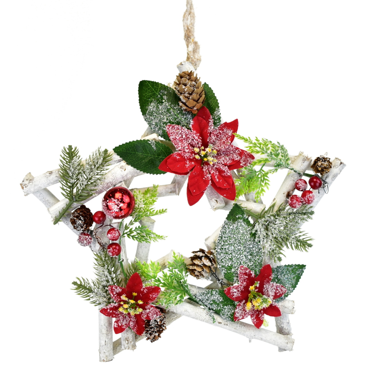 Zahalte váš domov do vánočního kouzla s touto nádhernou dřevěnou hvězdou zdobenou červenými ponsetiemi, zelenými větvičkami, červenými kouličkami, bobulemi a šiškami. Její lehký zasněžený lesk vám hned přivodí tu pravou vánoční atmosféru.