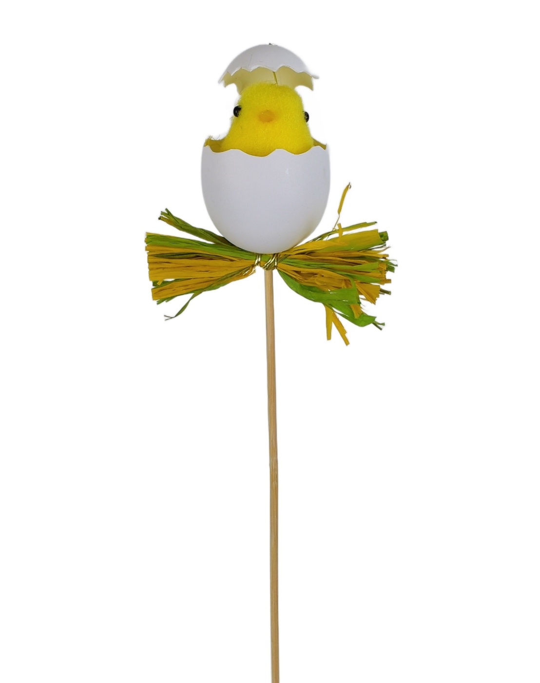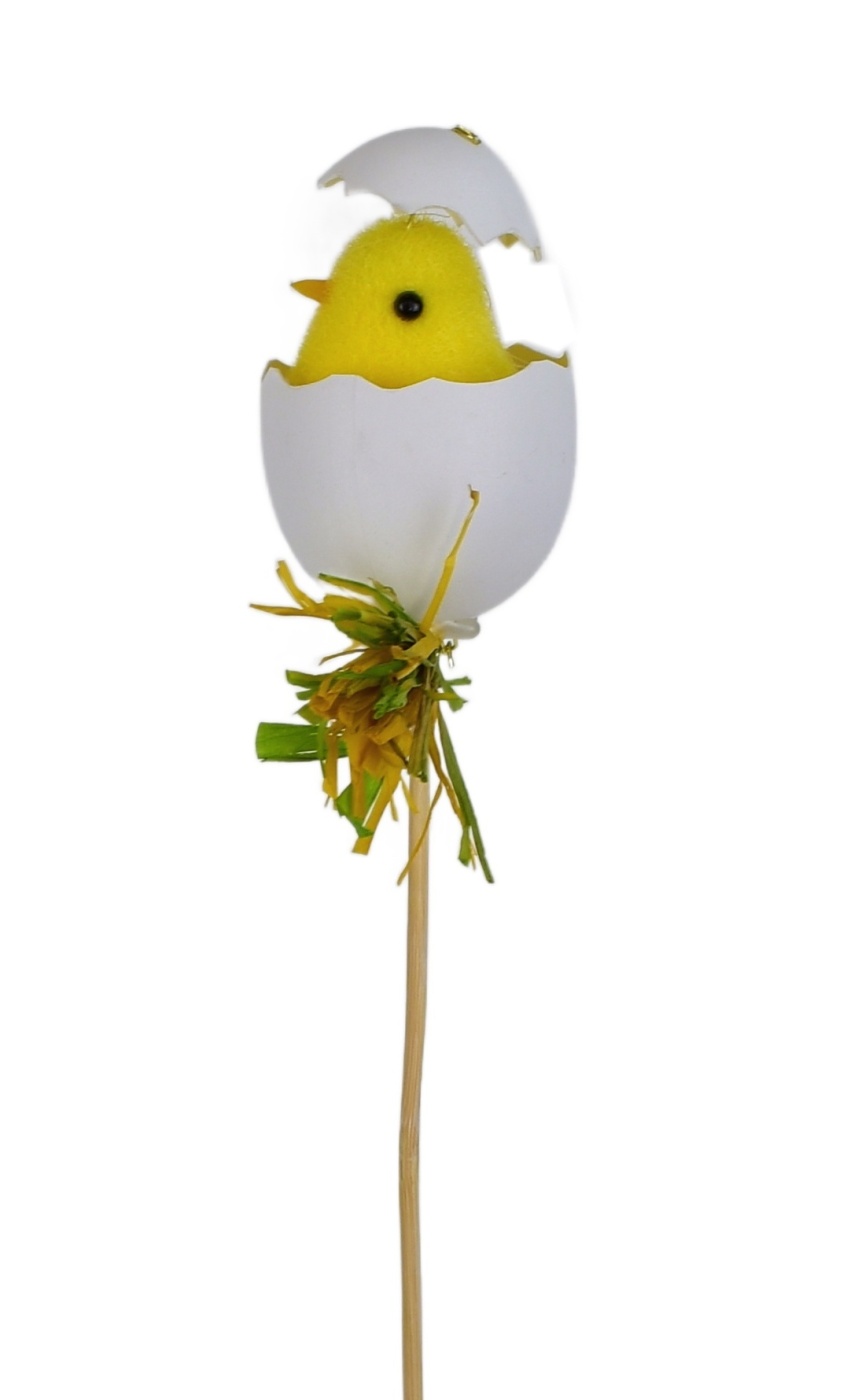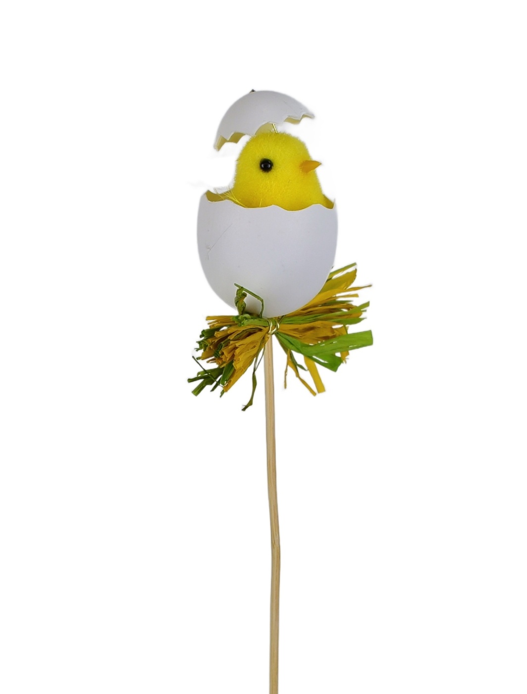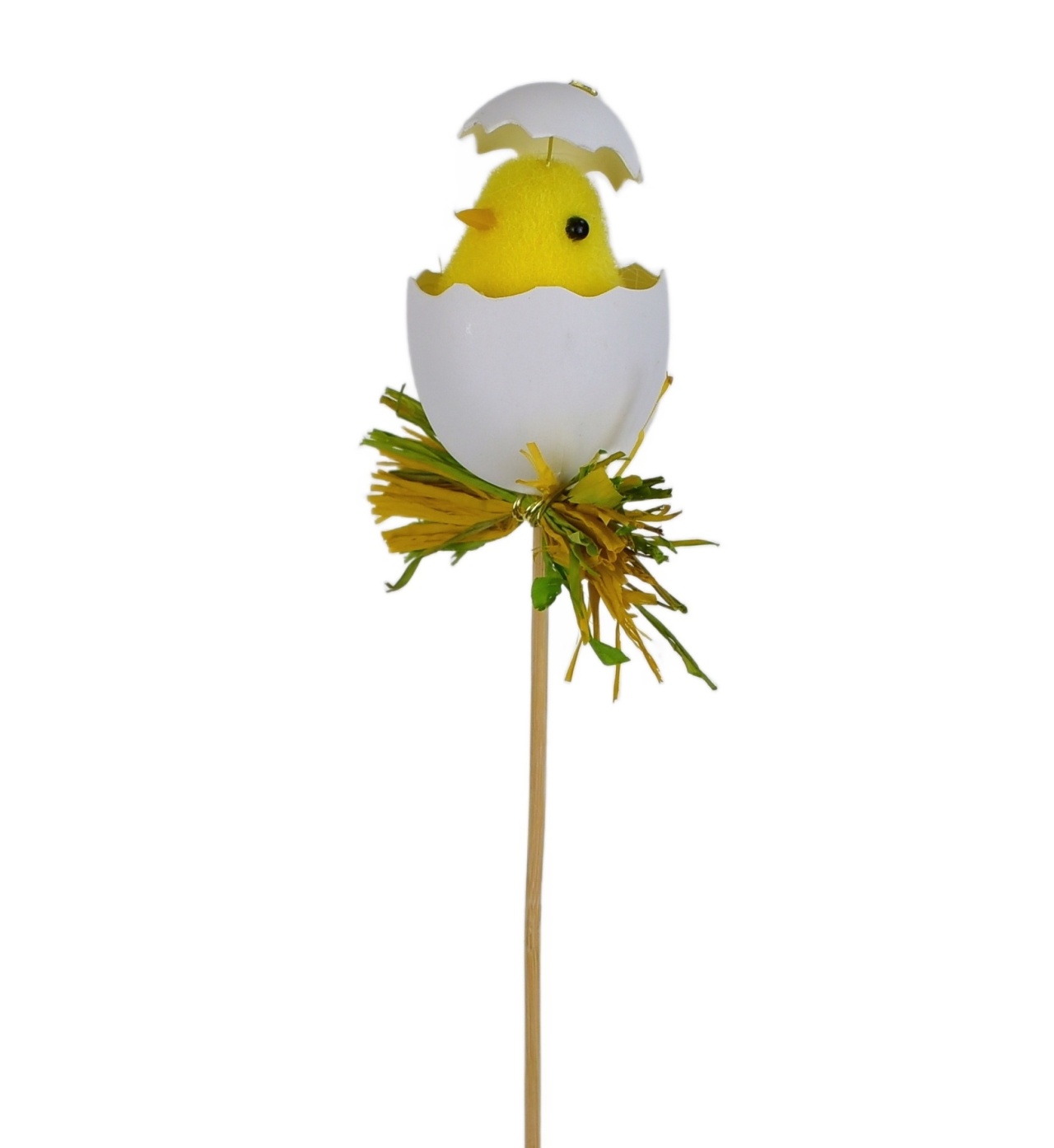 Tento zápich se skládá z kuřátka ve vajíčku, které je umístěno na špejli. S jeho výškou 35 cm (včetně špejle) a kuřátkem o velikosti 8 cm, je tento velikonoční dekorativní předmět ideální na umístění na stůl, polici nebo jako ozdoba do květinového aranžmá.