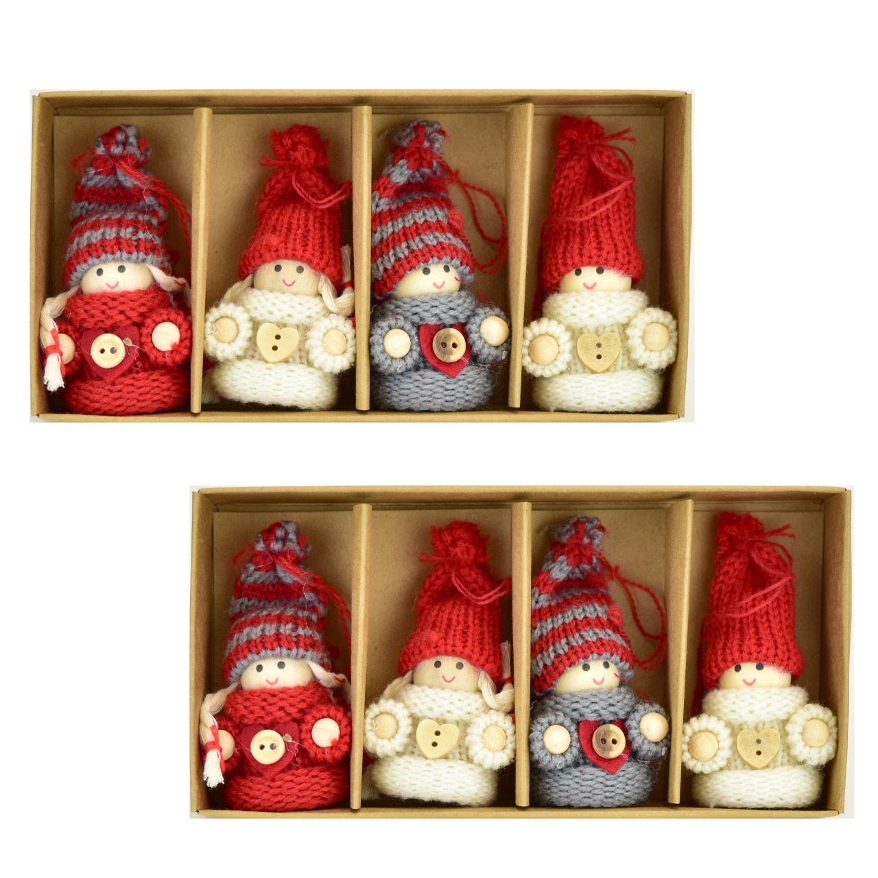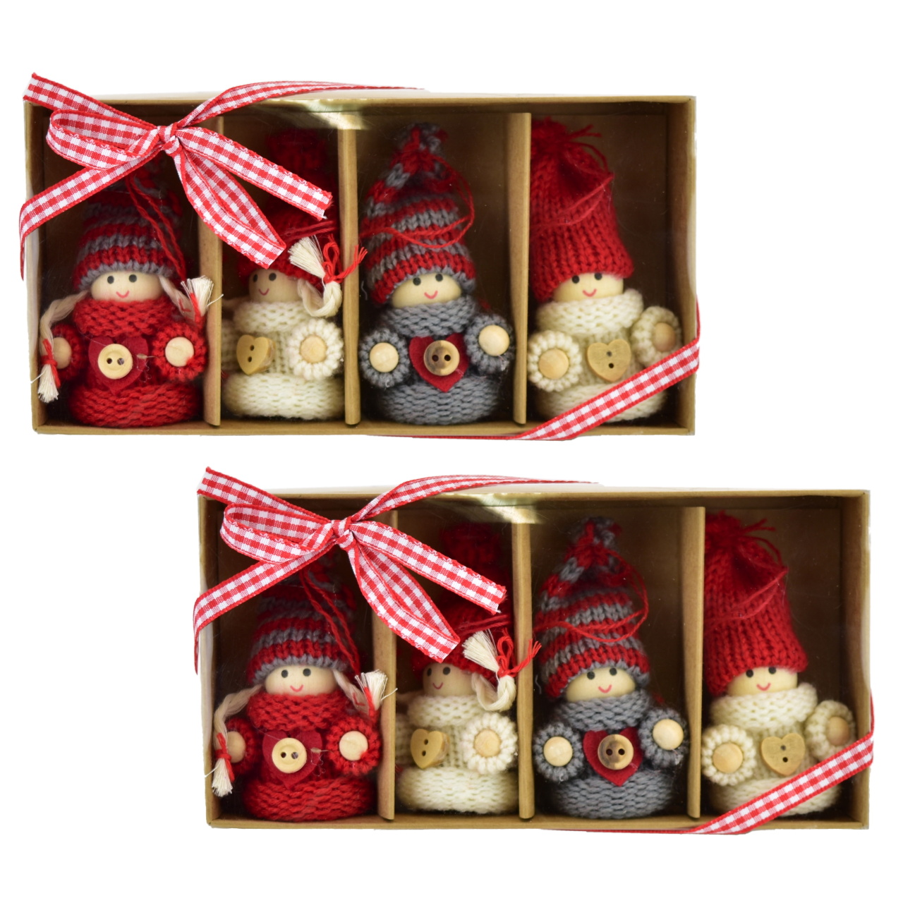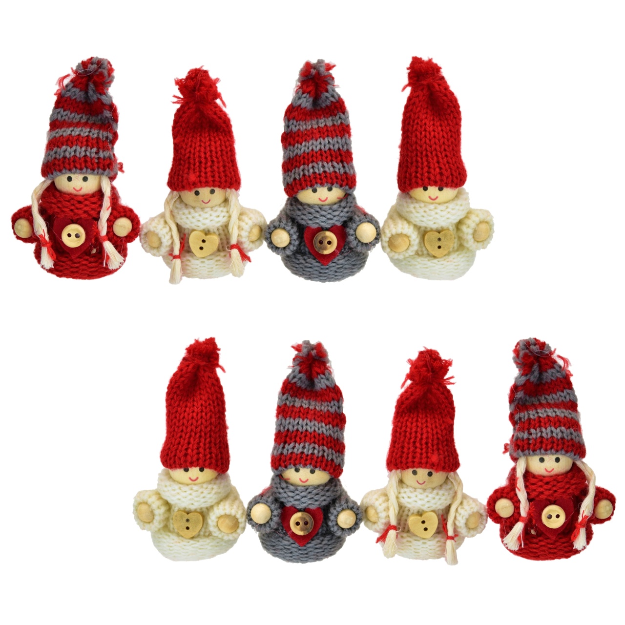 Pletené panenky v barevných kombinacích červené, šedé a krémové tvoří ideální dekoraci pro váš vánoční stromeček nebo jako součást interiérového designu. Tento praktický set obsahuje: