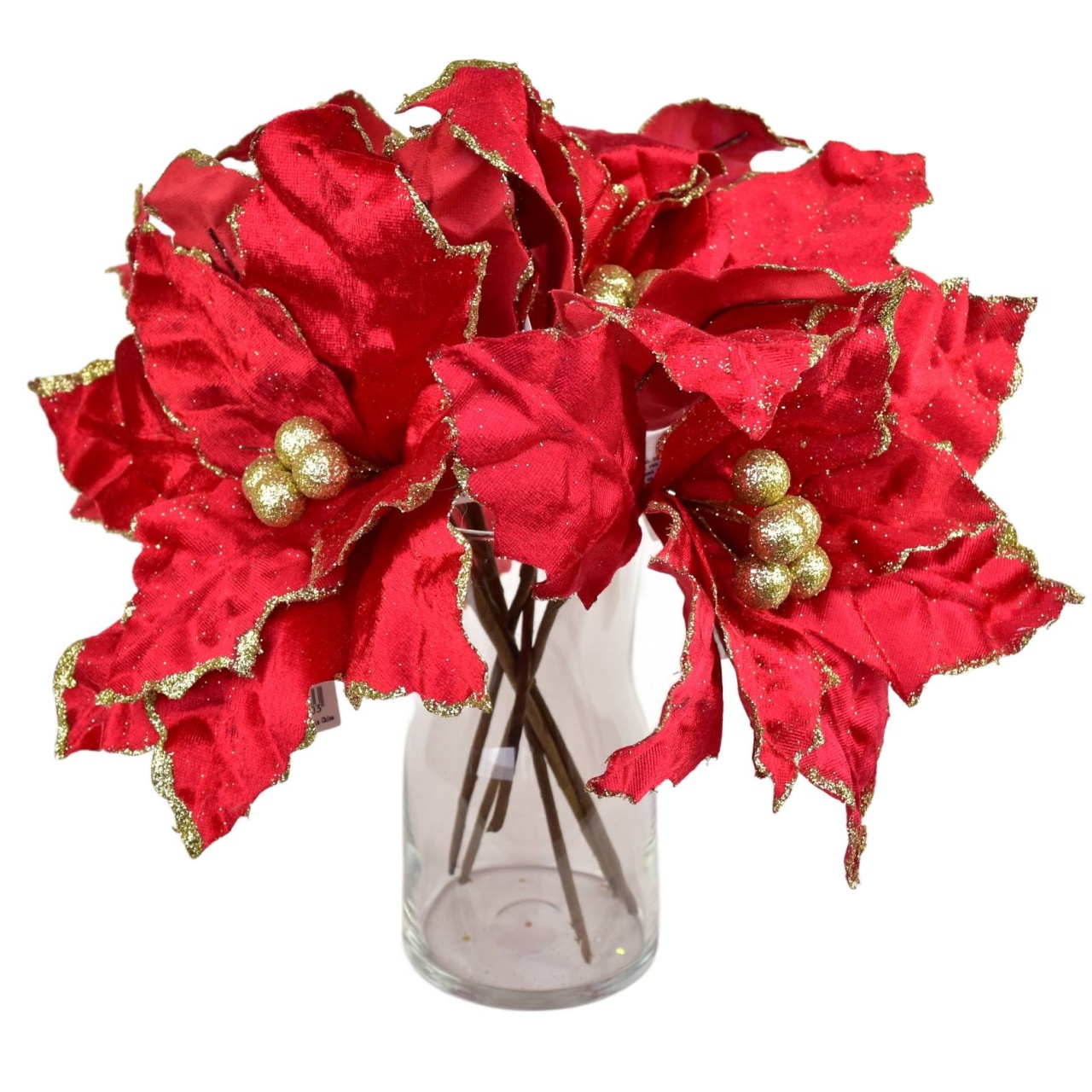 Poinsetie květ zápich textilní třpytivá červená Ø25 cm, 6 ks