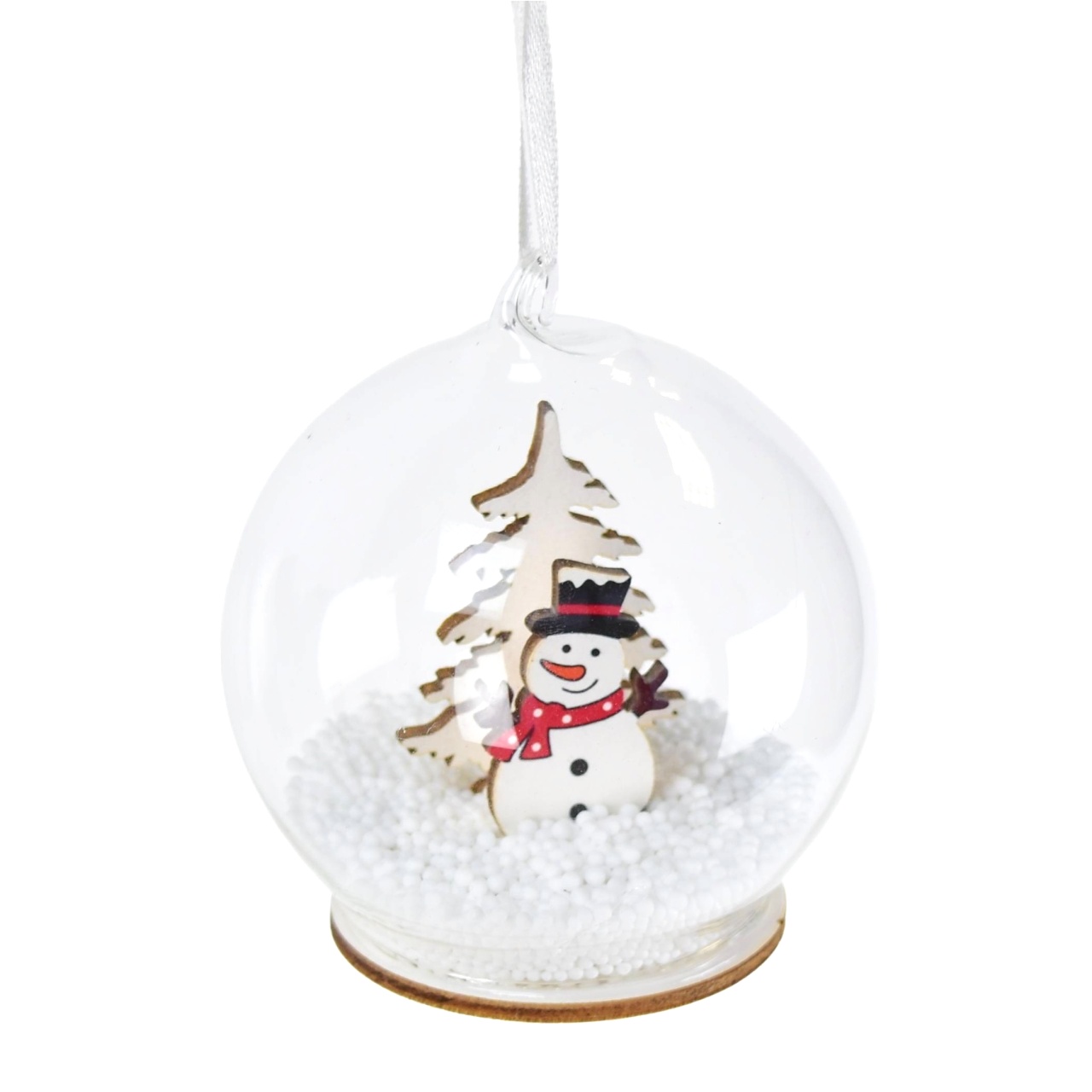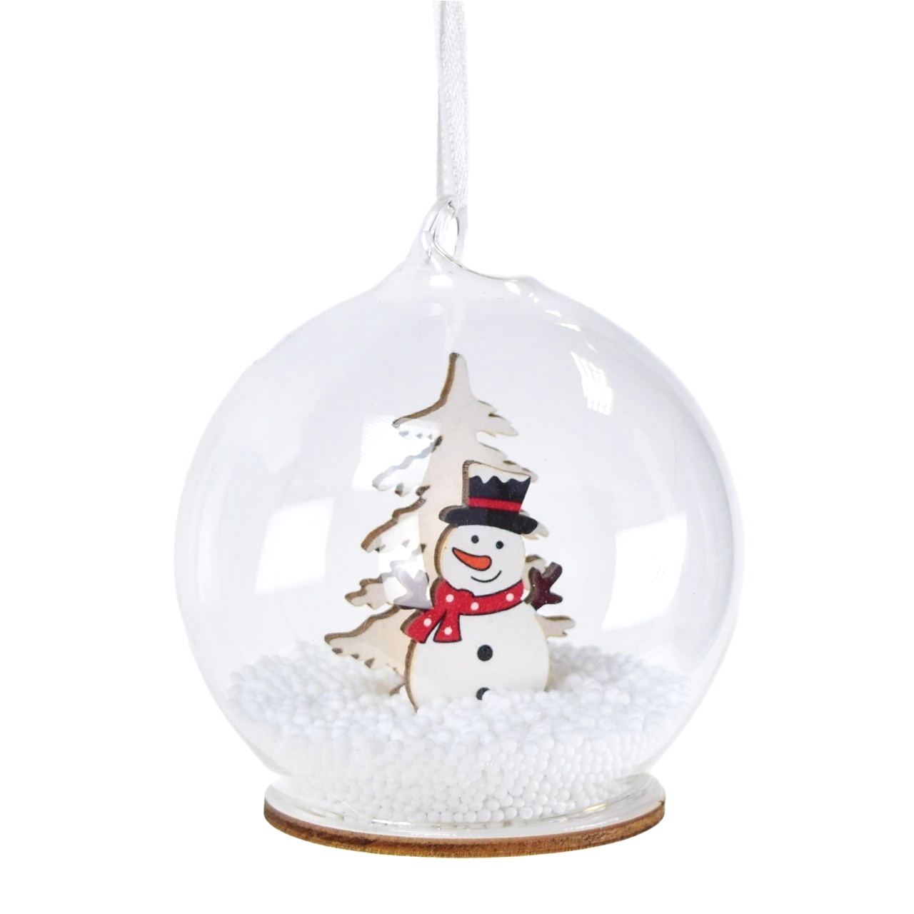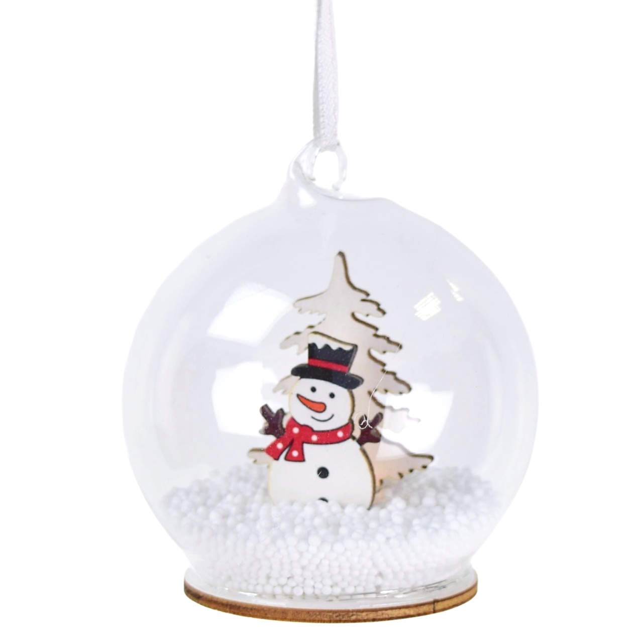 Průhledná baňka se sněhulákem a s LED osvětlením o průměru Ø8 cm je ideální dekorací pro vaši vánoční atmosféru. Tento set obsahuje 3 kusy, které lze snadno zavěsit na vánoční stromeček nebo použít jako stylovou dekoraci v interiéru. Uvnitř koule se nachází sněhulák a dřevěný stromek, doplněný o 1x LED osvětlení a bílé kuličky, které skvěle imitují sníh.