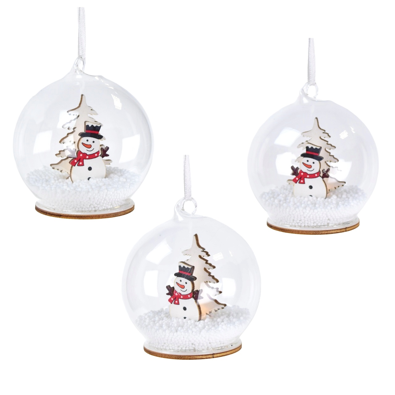 Průhledná baňka se sněhulálkem a s LED osvětlením Ø8 cm, set 3 ks